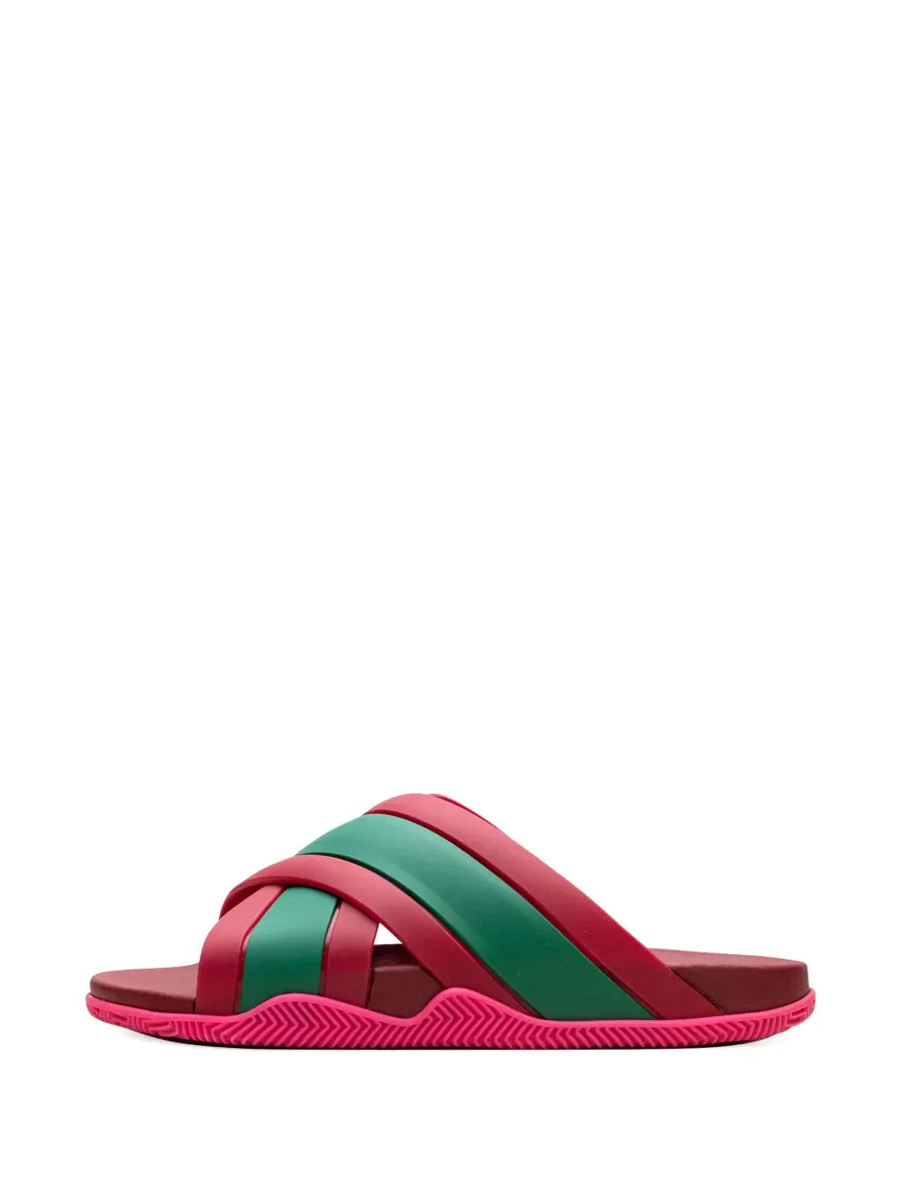 Sashay your way into style with these Gucci Web Slide Sandals. The scarlet color pops with signature Web detailing, adding a touch of boldness to any outfit. The crossover strap detail and round open toe provide comfort and style, while the branded footbed adds a designer touch. Walk with ease in the flat sole. It's fashion-forward meets functional!