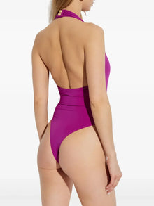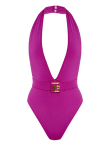 Make a bold statement with this purple Balmain logo swimsuit featuring a flattering V-neck and stylish halterneck design. Its open back adds a touch of allure, perfect for turning heads at the beach or poolside. Combining elegance and comfort, this swimsuit is a must-have for your summer wardrobe.
