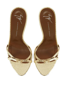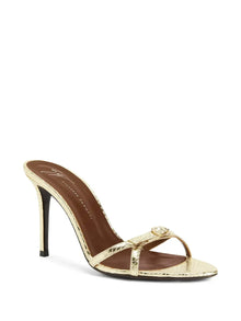 Elevate your style with the Giuseppe Zanotti 90mm Ophelia sandals. Featuring a sleek gold-tone finish and a high stiletto heel, these slip-on sandals combine elegance with effortless wearability. The decorative buckle detail adds a touch of sophistication, while the branded footbed ensures comfort with every step. Perfect for making a statement at any event, these sandals bring luxury and confidence to your wardrobe.