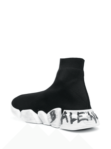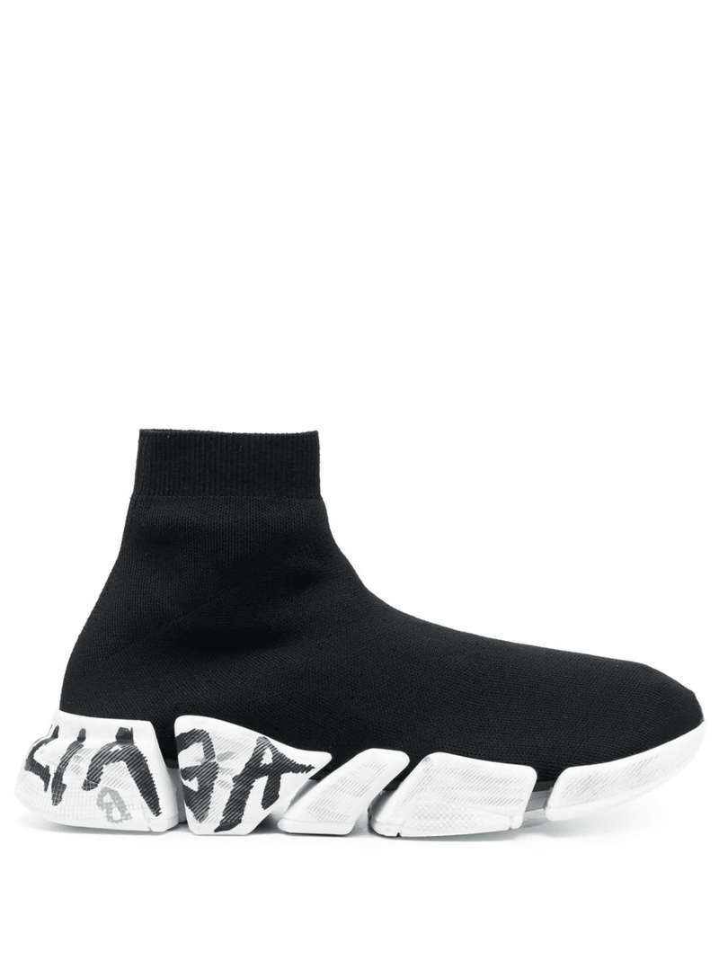 Get ready for the ultimate sneaker sequel - the Balenciaga Speed 2.0 graffiti sneakers! Made in Italy with a 3D-knit construction and revamped with a recycled material, these slip-on sneakers feature a cool graffiti print and a strong, segmented rubber sole for extra flexibility. Upgrade your sneaker game with these iconic and unique kicks!