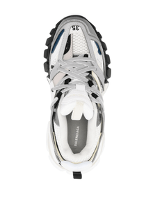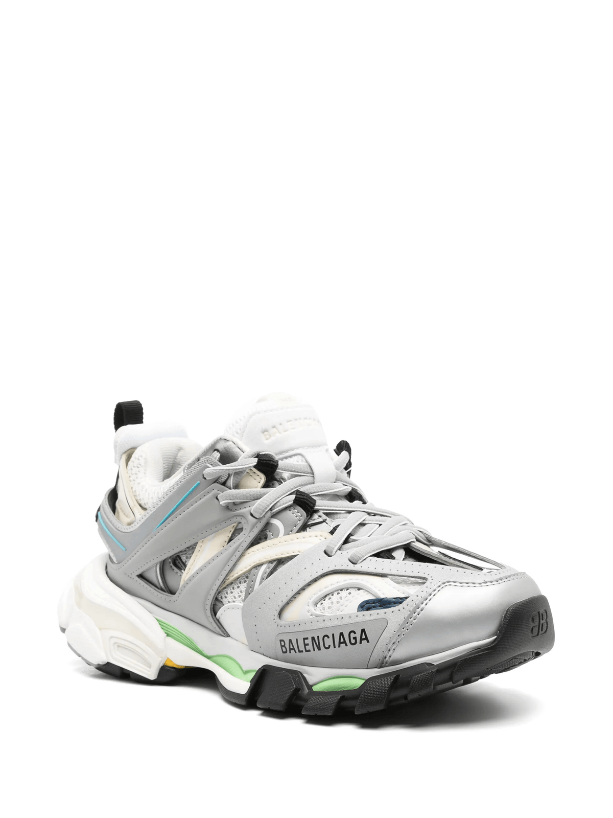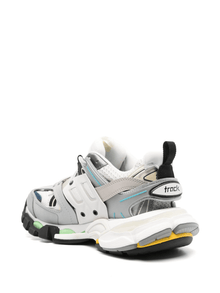 The Balenciaga Track sneakers are a perfect balance of style and comfort. With a zen grey and white colorway and layered design, these shoes are sure to make a statement. Featuring mesh panelling for breathability and branded details like a logo print, debossed tongue, and model embroidery, these sneakers have it all. The chunky rubber sole provides support and the double pull-tab at the opening makes them easy to put on. Stay stylish and comfortable all day long with these must-have kicks.