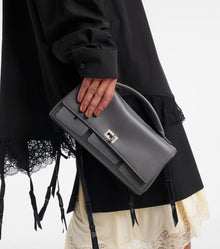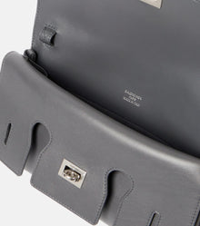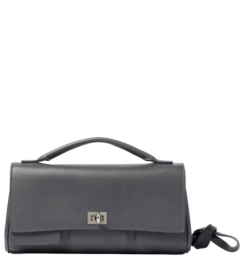 Crafted in Italy from smooth grey calf leather, the silhouette is defined by sharp lines, silver-tone hardware, and a structured form that balances function with modern luxury.