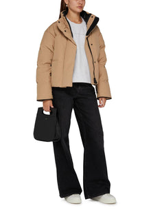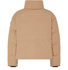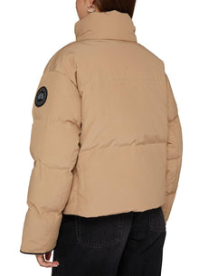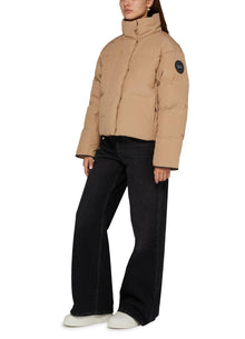 DESCRIPTION : concealed zipper closure, logo at the back, logo on the side, appliquéd logo, short, high neck, side welt pockets, long-sleeved, puffer jacket.