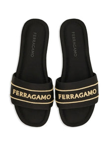 Step into effortless style with these Ferragamo logo slides. Crafted from sleek black leather, they feature an embroidered logo on the front for a touch of luxury. The branded insole ensures comfort, while the open toe and flat sole provide a relaxed fit perfect for everyday wear. Elevate your casual look with these timeless slides.