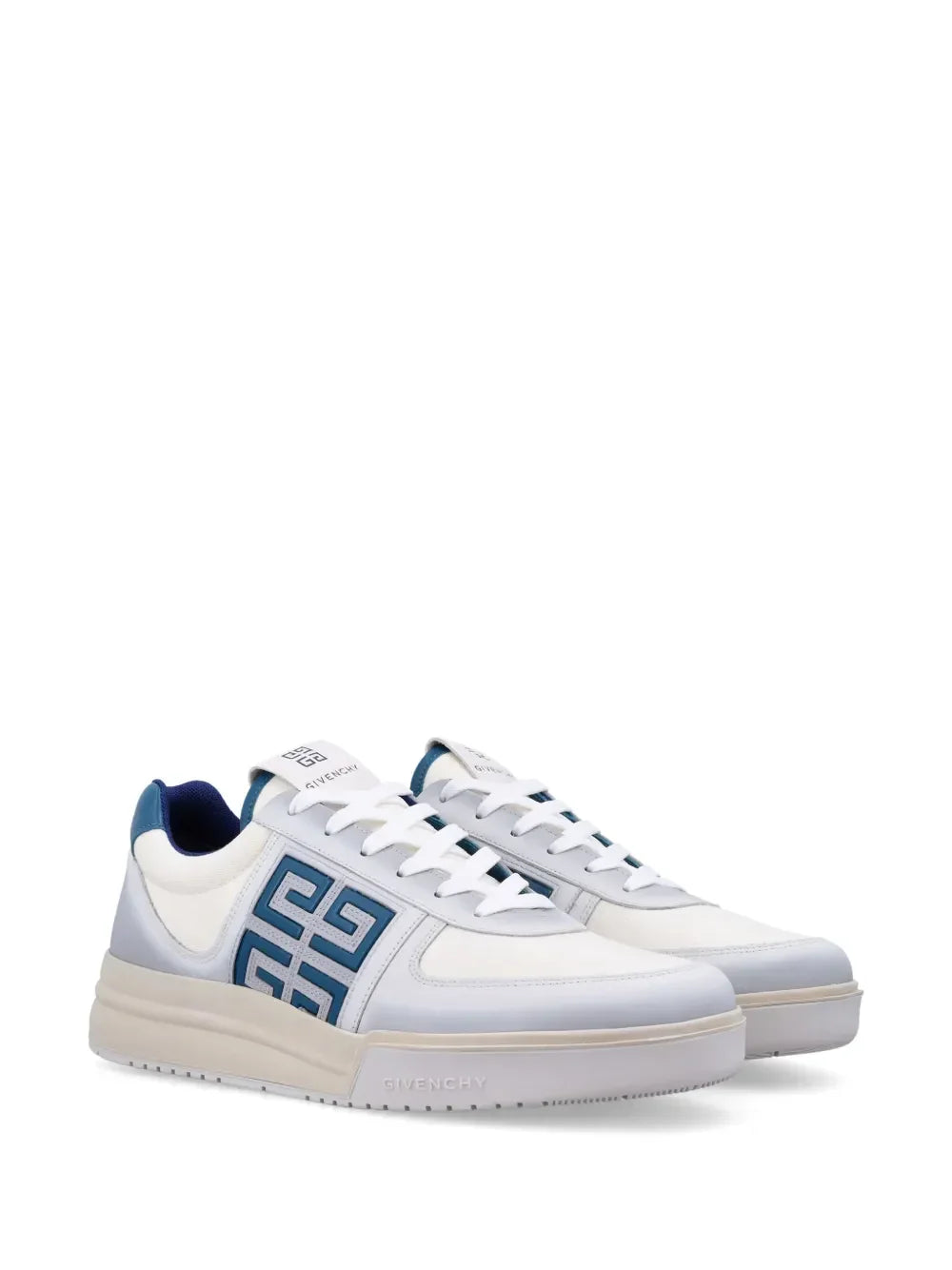 Step out in style with Givenchy's G4 low-top sneakers. These sleek sneakers feature a bold blue and white color scheme and a unique combination of canvas and leather materials. The signature 4G motif adds a touch of luxury, while the front lace-up fastening and flat rubber sole provide maximum comfort and support. Perfect for any casual outfit, these sneakers are sure to turn heads wherever you go.