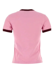 Add a pop of color to your wardrobe with our GUCCI Pink T-shirt! The flamingo pink hue is sure to turn heads, while the embroidered GG logo adds a touch of sophistication. Complete with a crew neck and short sleeves, this tee is perfect for any occasion. Don't miss the contrasting border for a unique touch.