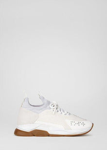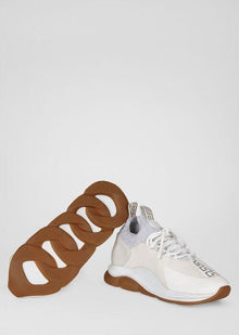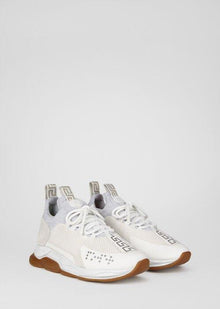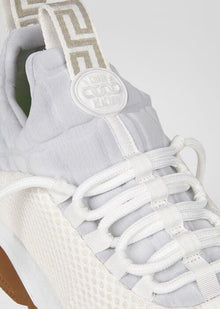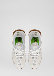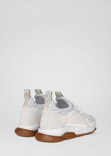 The Chain Reaction family welcomes its newest member - the Cross Chainer sneaker. The light runner sneaker is a fresh take on the Versace identity. Features the unmissable chain link outsole and Greca details, while the puff croc neoprene accents and rubber-dipped laces add a street edge. Braille "Power" and "Versace" lettering gives a bold statement.