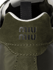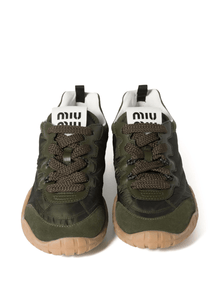 Rev up your style with Miu Miu Tyre sneakers. These forest green sneakers feature a front lace-up fastening and pull-tab at the heel for easy wear. The ridged rubber sole and branded insole provide both style and comfort. These sneakers are the perfect edgy addition to any outfit.