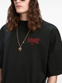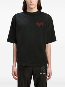 Elevate your street style with the Palm Angels logo-print cotton T-shirt. The soft cotton and jersey texture provide all-day comfort, while the iconic logo print on the chest and back add a touch of urban cool. The crew neck, drop shoulder, and straight hem create a relaxed fit perfect for any occasion.