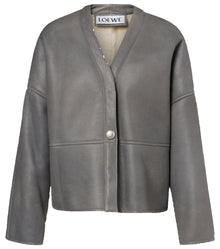 Loewe redefines the classic cardigan through the house’s sculptural leather craftsmanship. Made in Italy from supple lamb leather and fully lined in plush shearling, this jacket delivers exceptional comfort wrapped in quiet, architectural sophistication. Finished with a removable Anagram Pebble button, it balances heritage detail with refined modern minimalism.