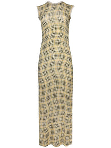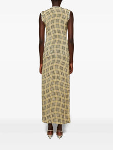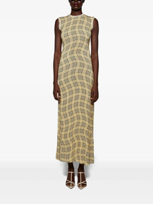 Go bold and playful with our Rabanne tartan-check maxi dress. This dress is highlighted by a vibrant light yellow color and features a concealed rear fastening for a sleek look. With a frayed brim and classic crew neck, this sleeveless dress is perfect for adding a touch of quirkiness to your wardrobe.