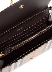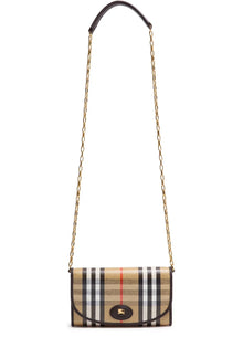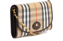 Burberry’s Highlands compact wallet with chain blends modern functionality with signature house codes. Crafted from embroidered canvas showcasing the iconic Burberry Check and Equestrian Knight Design emblem, it transitions seamlessly between a wallet, clutch, and mini crossbody. The detachable chain strap, interior slots, and secure snap-button closure make it as practical as it is elegant.