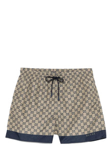 Experience effortless style and comfort with these Gucci printed poplin swim shorts. Featuring a versatile beige color and an elasticated drawstring waistband, they offer a perfect fit and easy adjustability. Crafted from lightweight poplin, these shorts are ideal for both poolside lounging and active beach days, combining luxury with practicality. Elevate your swimwear collection with a piece that blends iconic design and everyday comfort.