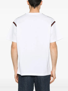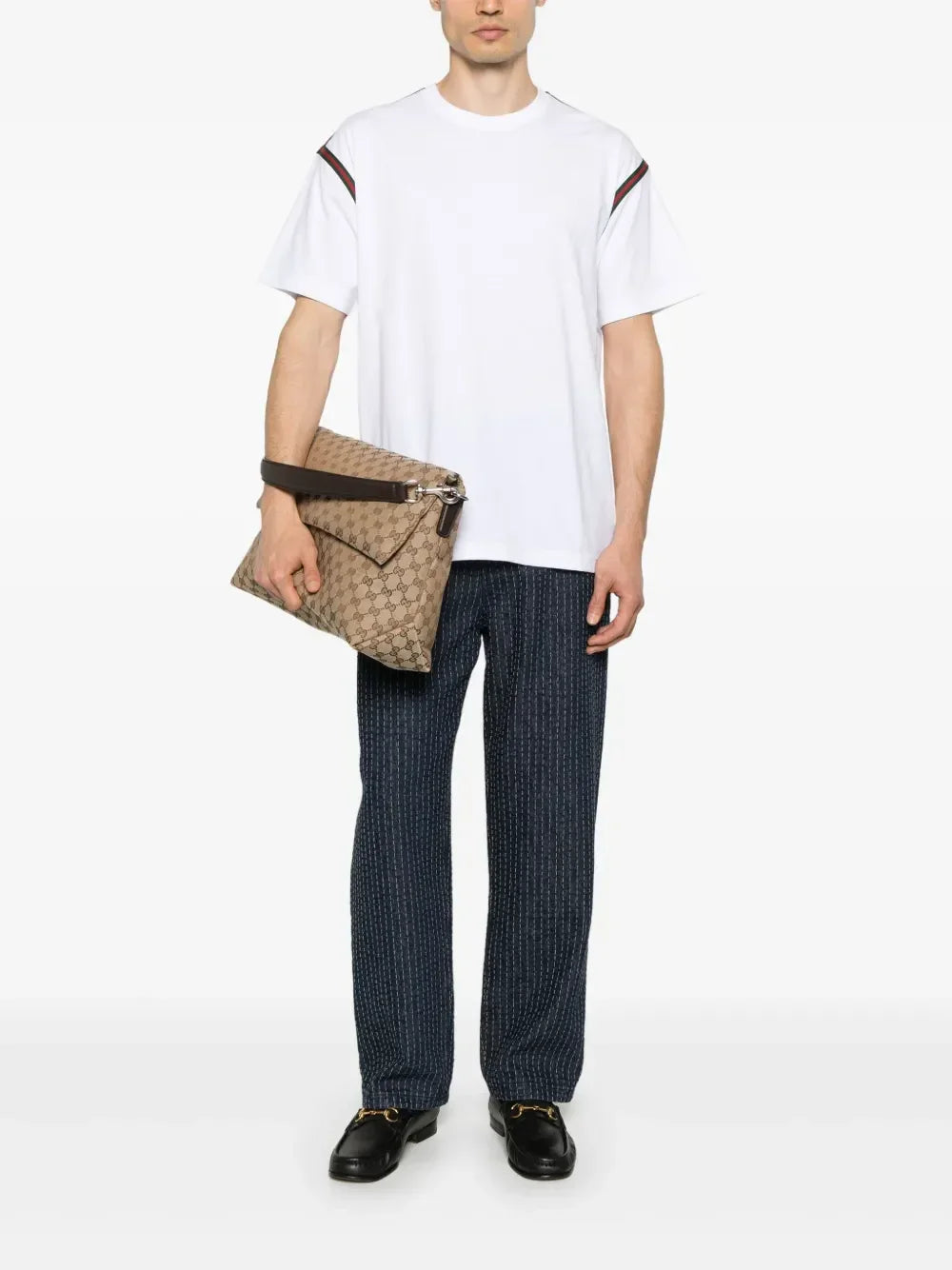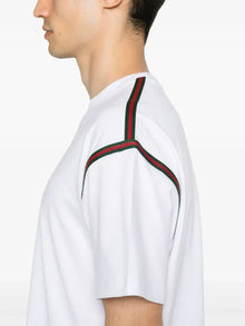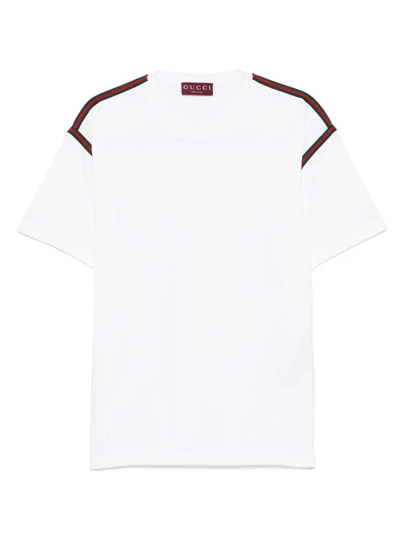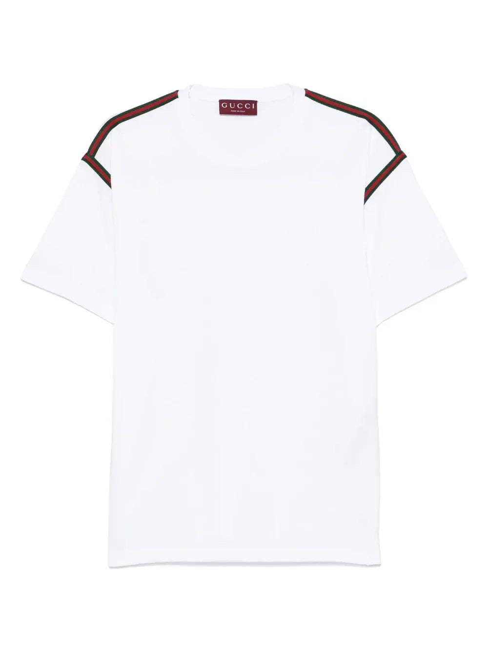 Elevate your basics with the Gucci Web-detail T-shirt. Sporting an embroidered logo at the chest, this white cotton tee features a classic crew neck and short sleeves. Perfect for dressing up or down, this tee is a standout piece that will add a touch of luxury to any outfit.