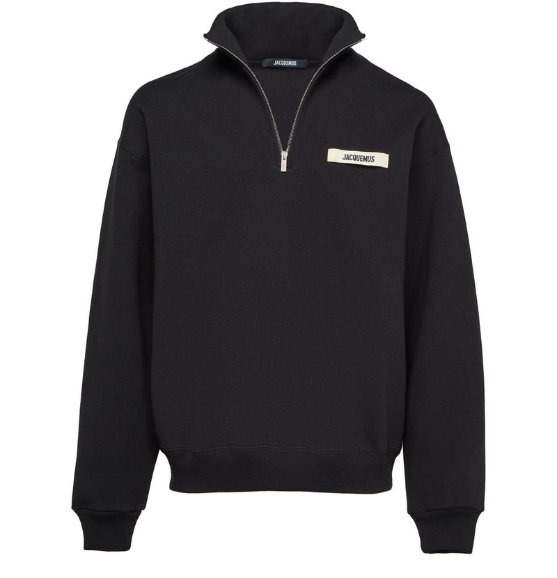 Stay sleek and stylish in the JACQUEMUS Grog grain zip-neck sweatshirt. Featuring a zipper closure, chest logo, and cuffed sleeves, this sweatshirt is perfect for any casual occasion. Made with 100% cotton, it offers both comfort and durability. Don't sacrifice style for comfort, get the best of both worlds with this versatile sweatshirt in classic black.