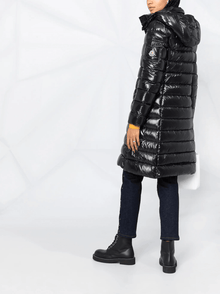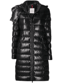 Stay warm and stylish this season with the Moncler Moka puffer coat. Its padded design and detachable hood make it the perfect choice for braving the cold. Made in Italy and featuring a logo patch at the sleeve, this coat is both functional and fashionable. Don't leave the house without it!