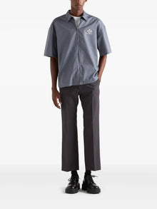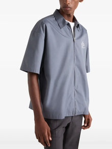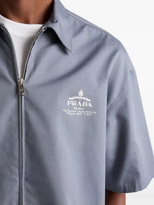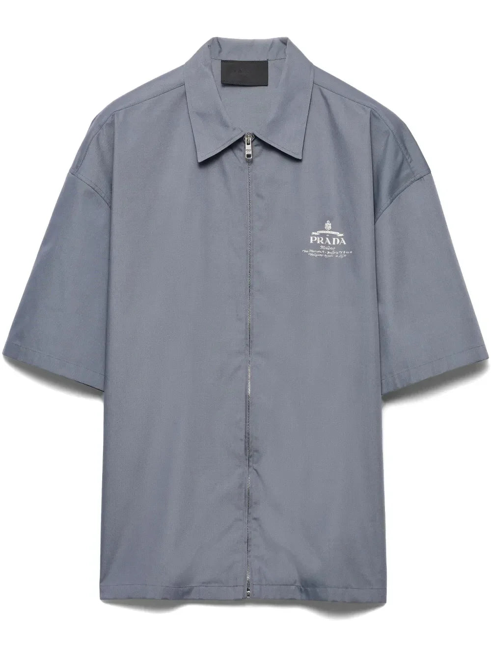 Be cool and confident in the Prada logo-print shirt. With a light grey background, front zip fastening, and drop shoulder, you'll look effortlessly stylish. Short sleeves and a straight hem provide a casual and comfortable fit. Perfect for any occasion, this shirt is a must-have for your wardrobe.
