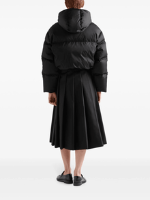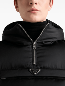 Stay warm and stylish with the Prada Re-Nylon cropped jacket. Made with recycled nylon and padded with goose down, this quilted jacket boasts a high neck and classic hood for added comfort. The half front zip fastening and drawstring hem add functionality while the enamel triangle logo adds a touch of branding.