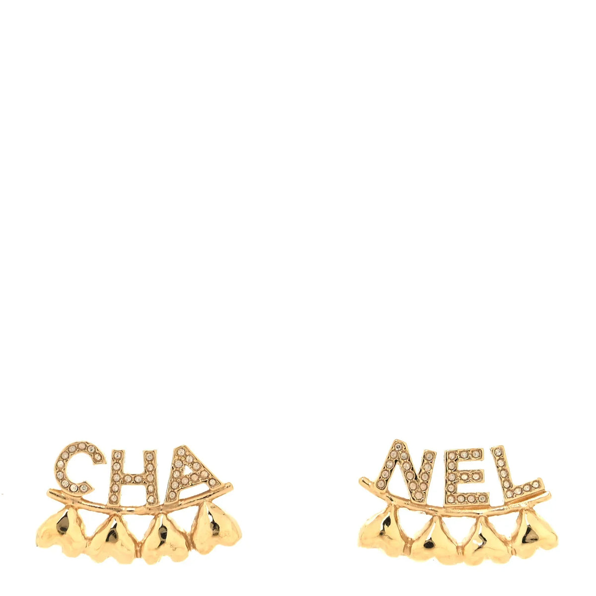 Elevate your style with these CHANEL Crystal Heart Cha-Nel Logo Earrings in gold. Featuring sparkling crystals set in elegant gold-tone letters, each earring spells out "CHANEL" when worn together. Perfect for adding a touch of luxury and sophistication to any outfit, these earrings make a bold statement while showcasing timeless elegance.