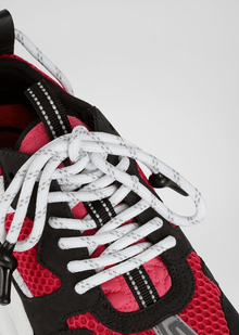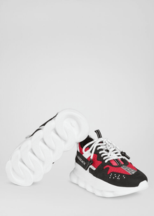 The Chain Reaction, una zapatilla que encarna los elementos más fuertes de la identidad de Versace. Los detalles eclécticos crean un zapato único caracterizado por una suela de goma ligera con eslabones de cadena que se inspira en las icónicas cadenas de joyería de Versace. Los elementos distintivos de las zapatillas más nuevas de Versace incluyen el icónico patrón Greek Key, el parche con el logotipo 'Chain Reaction' y las letras 'love' en braille que expresan el concepto de que el amor es ciego. .