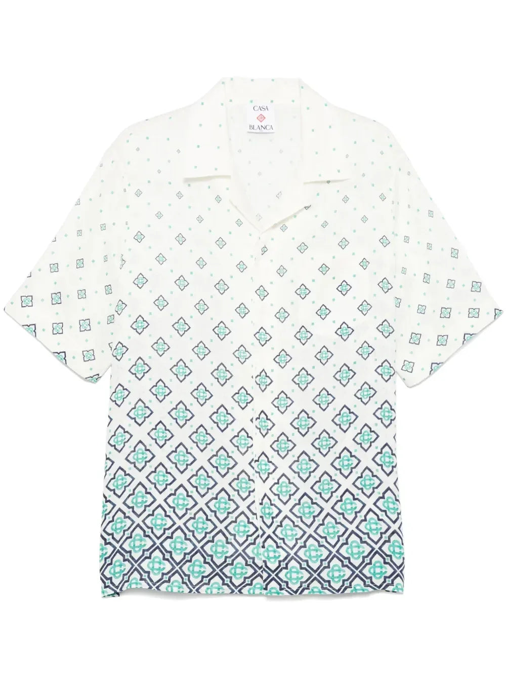 Elevate your wardrobe with the Casablanca monogram-print shirt, featuring a striking white and blue design. Its concealed front button fastening and classic Cuban collar offer a sleek, polished look, while short sleeves keep it cool and comfortable. The chest patch pocket adds a subtle touch of practicality, making this shirt perfect for both casual outings and stylish gatherings.