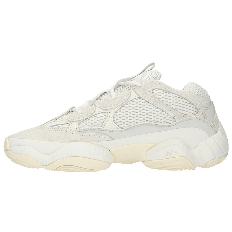 Kanye West y adidas revisan el Yeezy 500, esta vez en una combinación de colores 'Bone White'. Esta edición de agosto de 2019 sigue la silueta gruesa y establecida de la silueta con una parte superior de ante de vaca, cuero de primera calidad y malla en tonos blanquecinos. Como en combinaciones de colores anteriores, esta edición incluye detalles de ribetes reflectantes y el inconfundible diseño retro de la entresuela de baloncesto. La amortiguación adidas adiPRENE+ se combina bajo los pies con cápsulas de goma contorneadas para promover la tracción.
