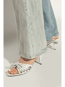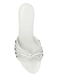 Introducing the Balenciaga Cagole mules, the perfect combination of sleek style and comfort. The smooth grain optical white leather is accented with delicate bow and strap detailing, adding a touch of femininity. Slip into these mules and strut confidently in their high stiletto heel. Made with 100% lamb skin outer and leather lining, these slip-on mules are a must-have for any fashion-forward individual.