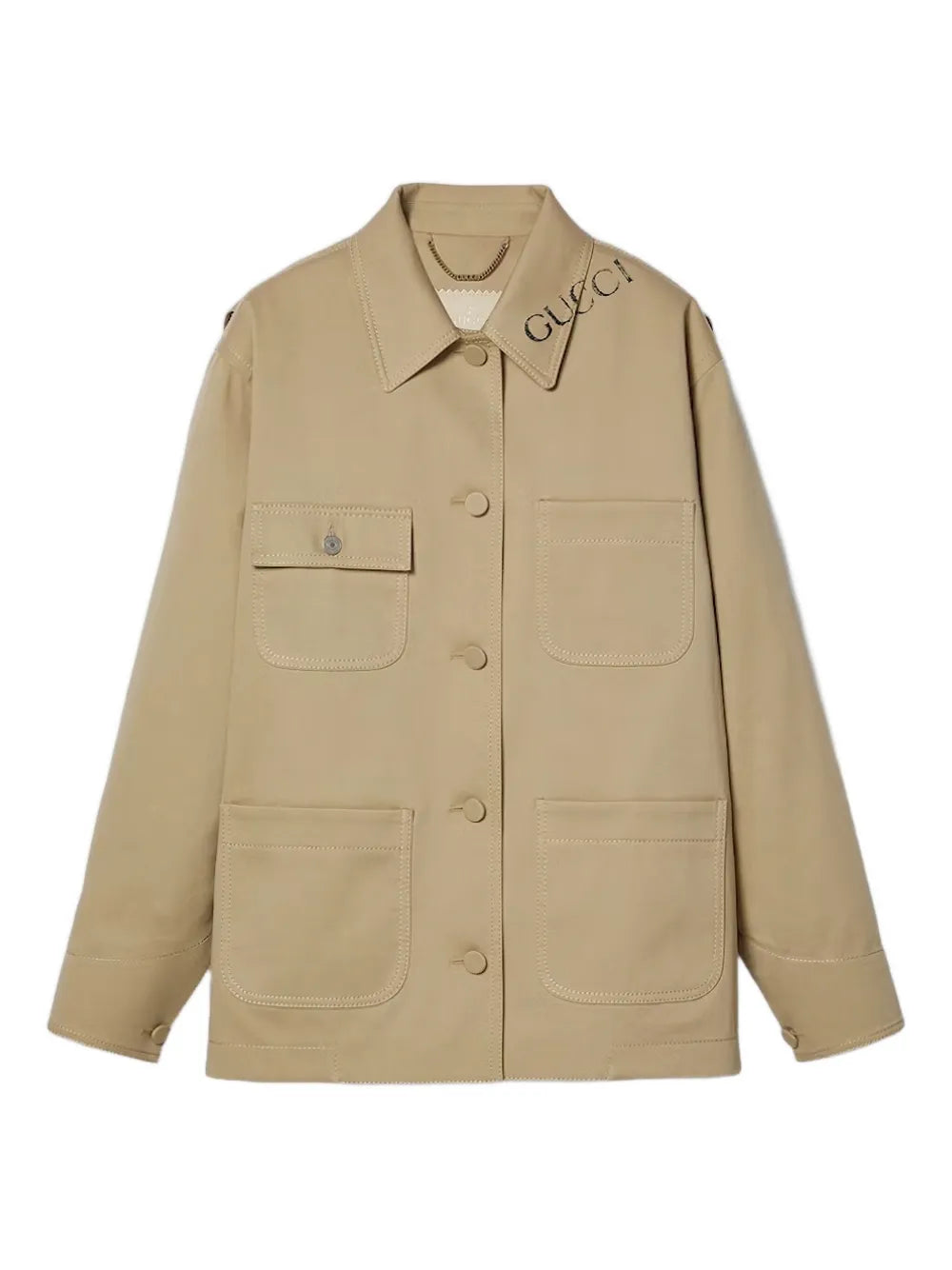 Cut in a soft beige cotton blend, the design features clean patch pockets, a crisp collared neckline, and a polished button-front closure. A subtle logo detail adds quiet Gucci identity while maintaining a minimalist, elevated profile.