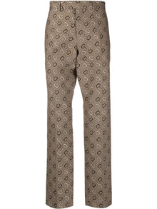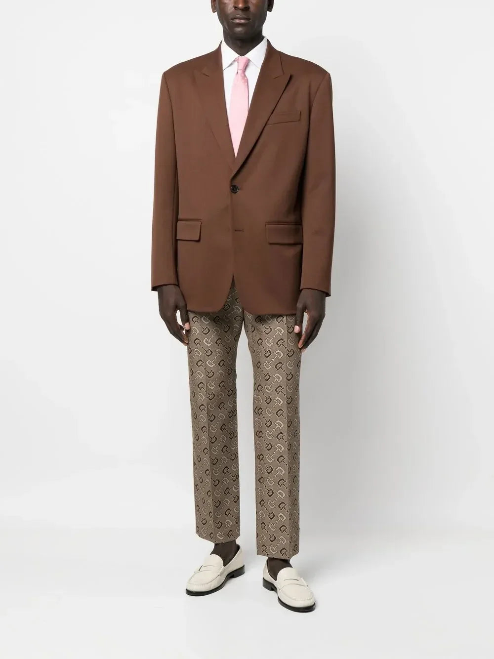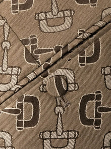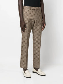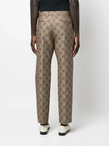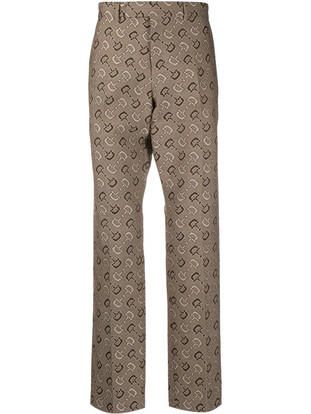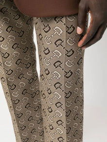 Elevate your wardrobe with these Gucci Maxi Horsebit-motif tailored trousers. Crafted from a beige cotton blend jacquard, they feature the iconic Horsebit detail and a pressed crease for a polished look. Designed with a straight leg cut, belt loops, and two rear welt pockets, these trousers combine classic tailoring with subtle luxury. The hook and zip fly fastening ensures a secure fit, making them perfect for both professional and stylish everyday wear.