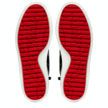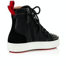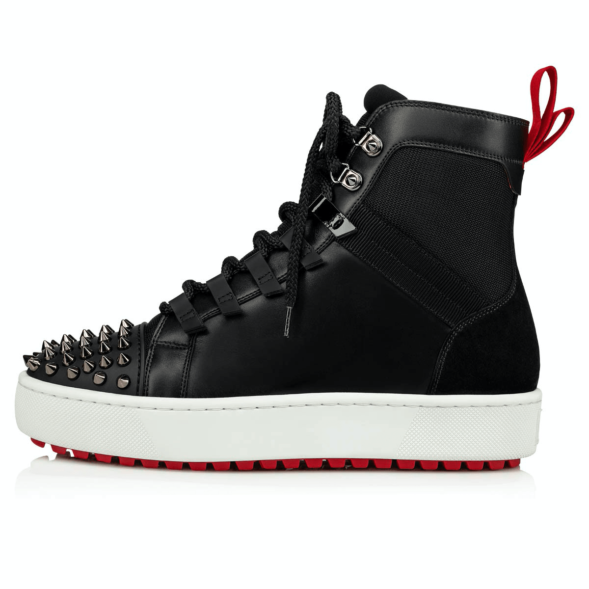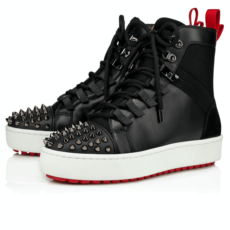 Inspirada en las botas de montaña Smartic, la zapatilla híbrida está confeccionada con piel de becerro granulada, grosgrain, malla y paneles de neopreno blanco. Su suela con tacos y su plantilla de silicona proporcionan un efecto de amortiguación. Su puntera plateada con tachuelas y su firma CL en relieve en la parte posterior lo convierten en un modelo reconocible al instante de la Maison Christian Louboutin.