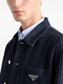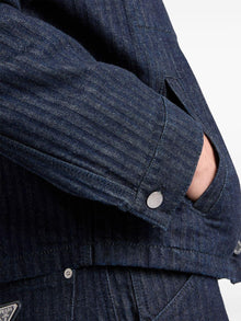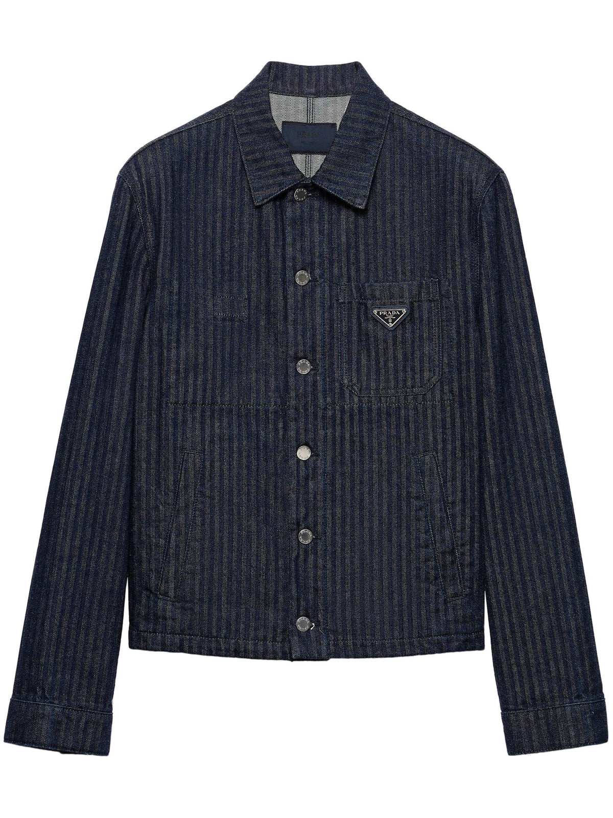 Add a touch of whimsy to your wardrobe with the Prada Chevron Denim Jacket! In midnight blue, this jacket features a front button fastening, chest patch pocket, and two side welt pockets. The buttoned cuffs add a polished touch to this playful piece. Made of 100% cotton for comfort and durability.