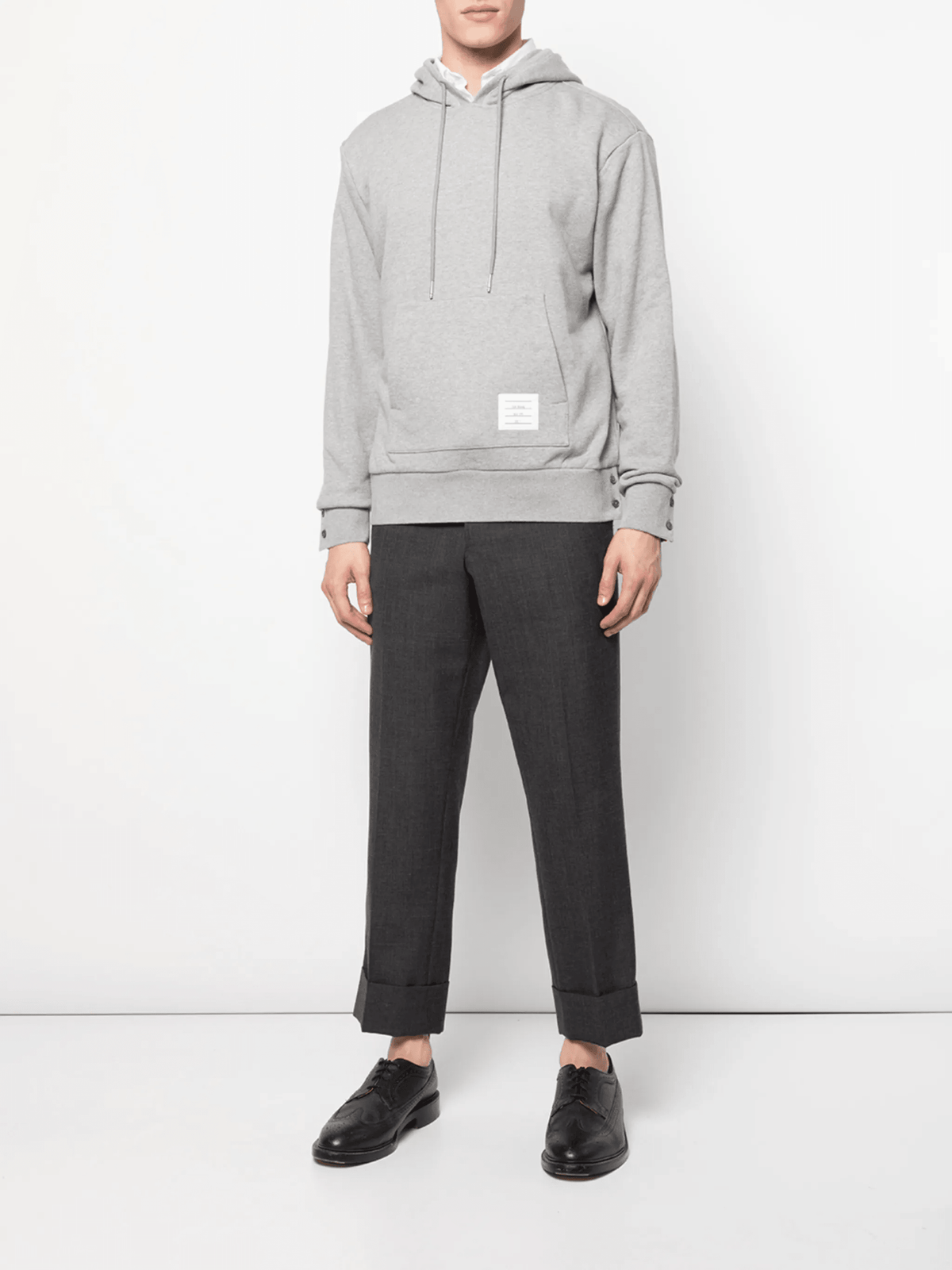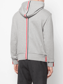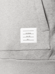 Stay stylish in this light grey Thom Browne hoodie. Made of soft cotton jersey fleece, it features the brand's signature stripe detail on the back and a logo patch on the front. The drawstring hood, front pouch pocket, and ribbed cuffs and hem make it both comfortable and functional.