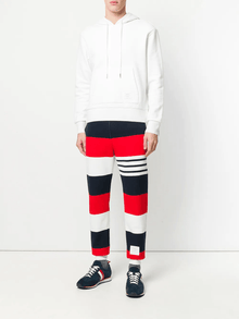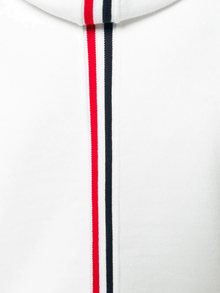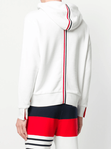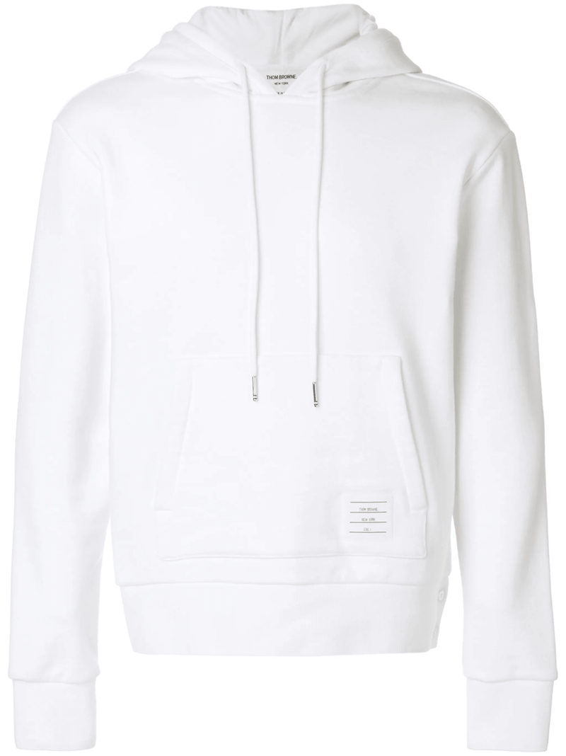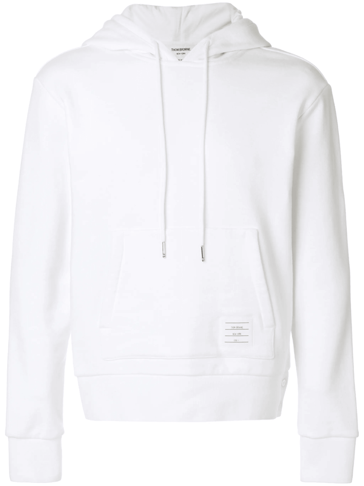Stay stylish in this white Thom Browne hoodie. Made of soft cotton jersey fleece, it features the brand's signature stripe detail on the back and a logo patch on the front. The drawstring hood, front pouch pocket, and ribbed cuffs and hem make it both comfortable and functional.