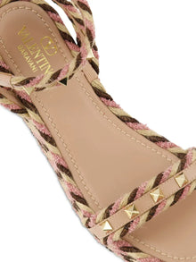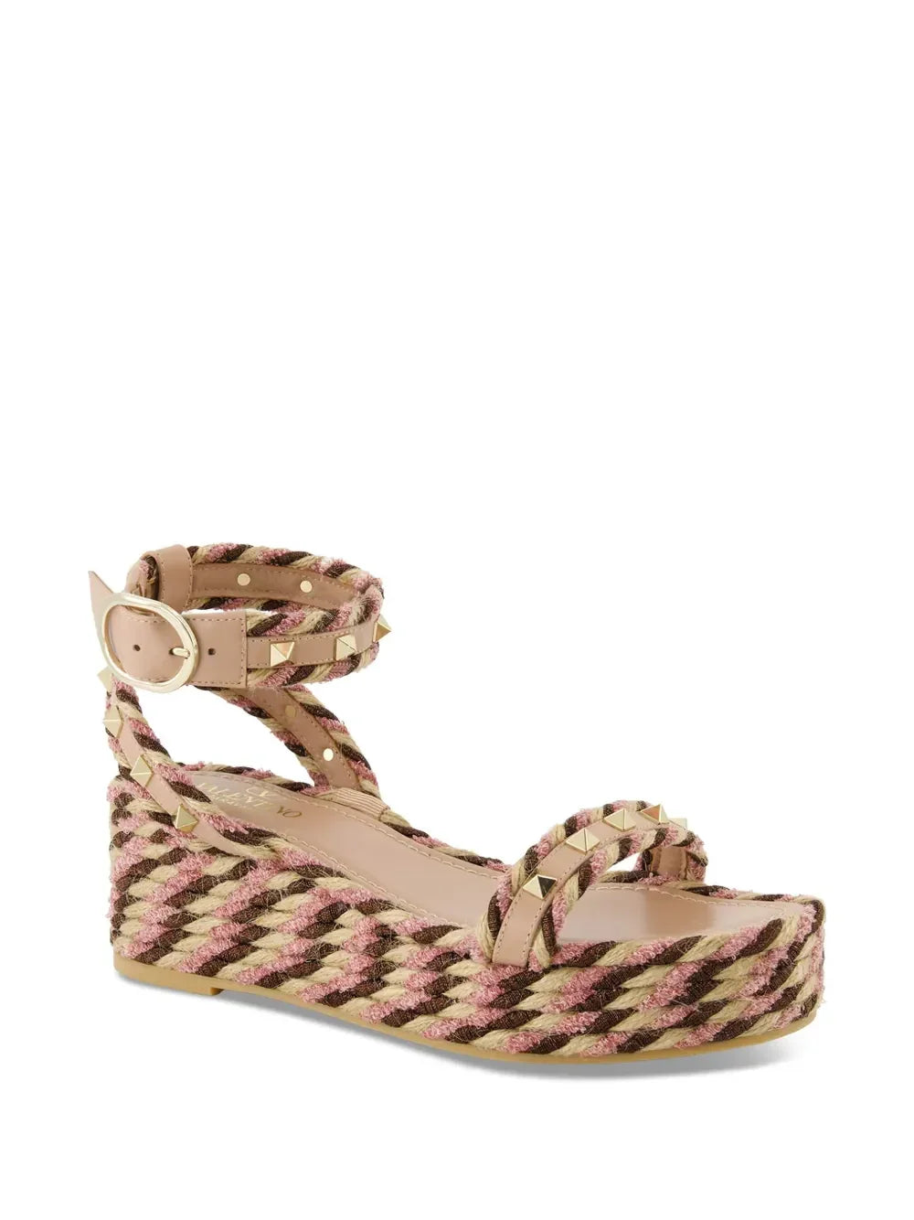 Step into bold elegance with these Valentino Garavani 45mm Rockstud flatform sandals. Featuring a chic pink and beige palette, braided straps, and an ankle buckle fastening, they offer both style and secure fit. The platform wedge sole adds height and comfort, while the open toe design keeps your look fresh. Decorative stud detailing brings a signature edgy touch, perfect for elevating any outfit with confidence and flair.