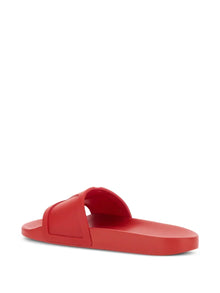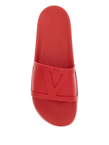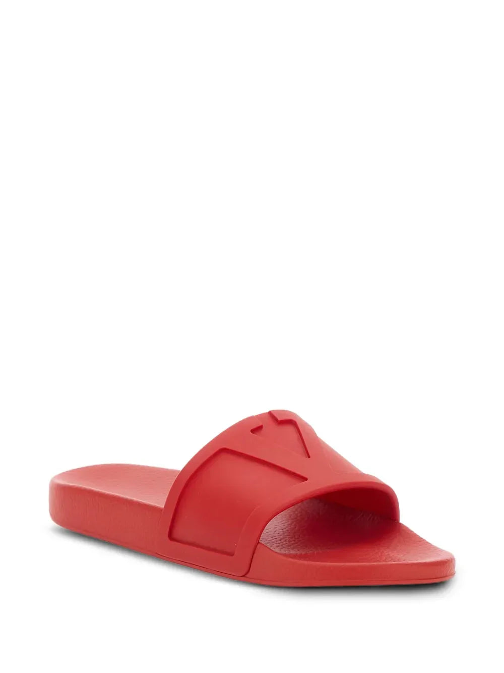 Slide into style with these ruby red Valentino Garavani slides. The slip-on style and flat rubber sole make them perfect for any adventure, while the moulded footbed and open toe provide comfort and breathability. These logo-embossed slides are a must-have addition to any wardrobe!
