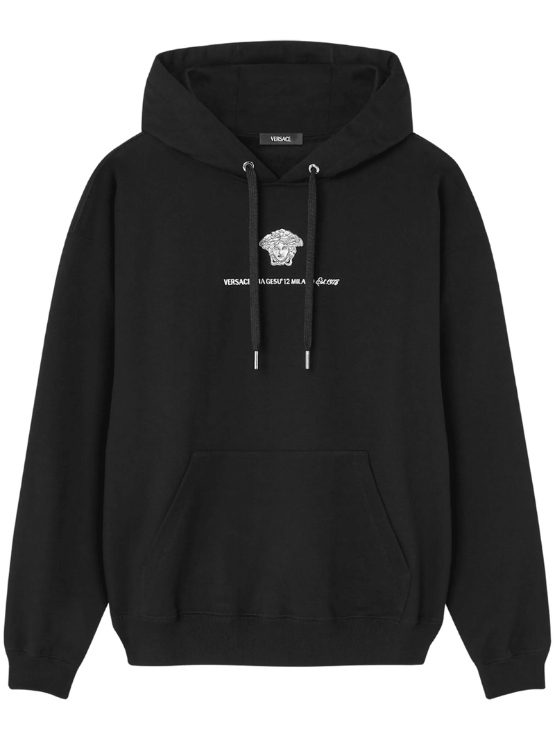 Stay effortlessly cool in the Versace Medusa Milano-embroidery hoodie. Crafted from 100% cotton, this black hoodie features an embroidered logo on the front, a drawstring hood, and a front pouch pocket. The ribbed cuffs and hem add a touch of style to this cozy essential.