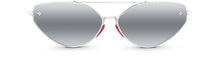 - DESCRIPTION : silver finish, mirrored lenses, logo on the lenses, cat-eye shape, metal temples, thin temples.