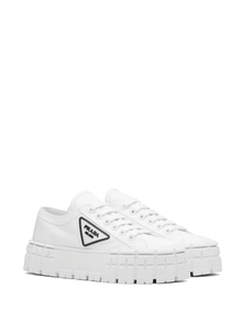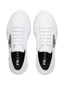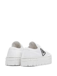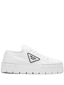 These Prada Double Wheel low-top sneakers combine style and sustainability with a gabardine weave made from recycled polyamide. Featuring a bold two-tone design and the iconic triangle logo, these sneakers also offer a comfortable fit with a platform sole and chunky rubber sole. Available in black/white.
