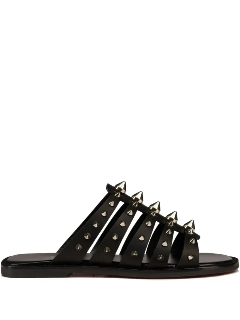 Step out in style with these Christian Louboutin slide sandals, featuring bold black studded detailing that adds an edgy touch to any outfit. The open-toe design and flat sole ensure comfort and breathability, while the slip-on style with multiple straps offers easy wear and a secure fit. Perfect for making a statement with effortless ease.