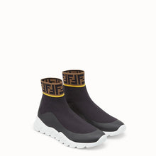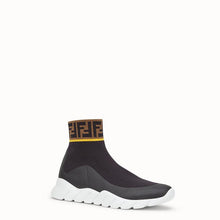 Baskets de course avec une silhouette de chaussette caractéristique. Réalisé en tricot technique extensible noir imperméable et antibactérien. Bord fini avec une bande sport jaune et un motif FF dans des tons de noir et de tabac. Les détails en film caoutchouté accentuent la forme des chaussures. Semelle ondulée en caoutchouc.Shipping & Returns