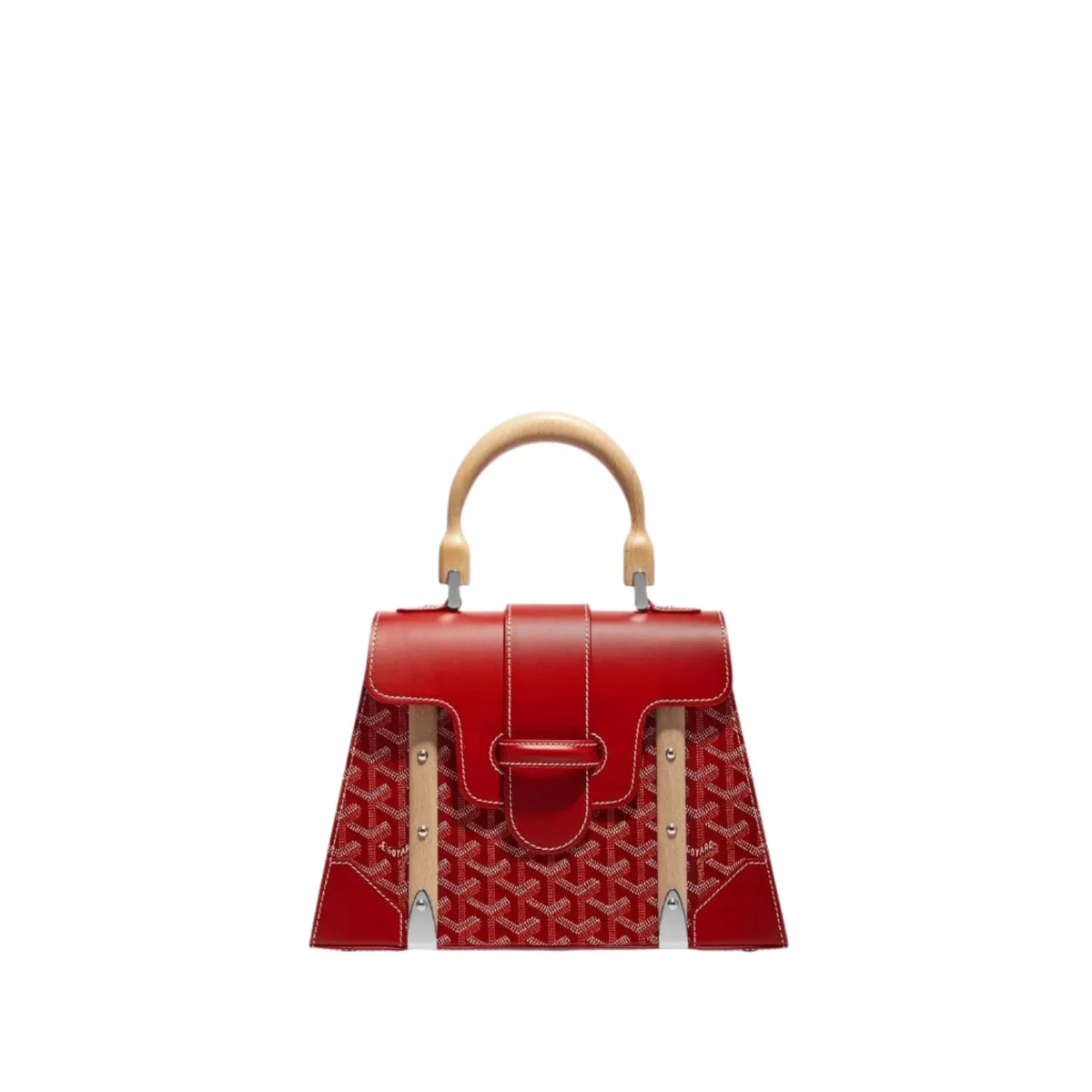 Carry your essentials in style with the GOYARD Goyardine Saigon PM Red Top Handle Bag. Crafted with attention to detail, this bag features a unique wooden handle and front panels, contrasted by a classic red canvas with the iconic Goyard chevron print. The cross-over leather top flap adds a touch of elegance to this quirky and playful piece.