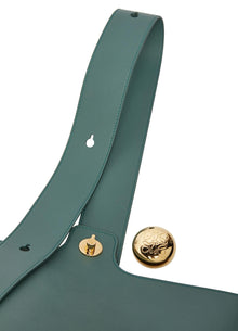 DESCRIPTION : single compartment, logo on the side, engraved logo, gold finish, wide strap, single handle, hand carried, adjustable strap.