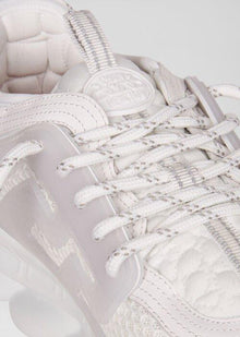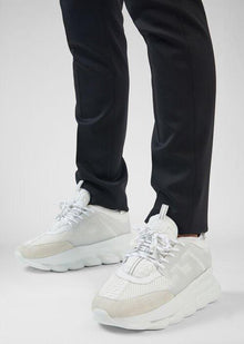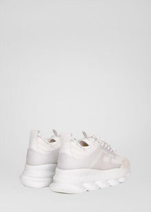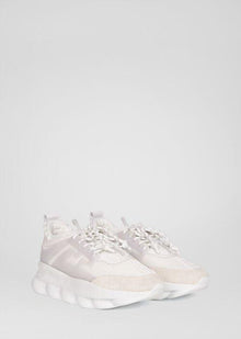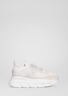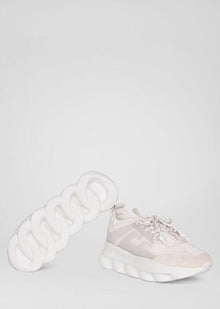 La Chain Reaction, une sneaker qui incarne les éléments les plus forts de l'identité Versace. Des détails éclectiques créent une chaussure unique en son genre caractérisée par une semelle en caoutchouc légère à maillons de chaîne qui s'inspire des bijoux en chaîne emblématiques de Versace. Les éléments emblématiques de la nouvelle sneaker Versace incluent le motif emblématique Greek Key, le logo « Chain Reaction » et le lettrage en braille « love » exprimant le concept selon lequel l'amour est aveugle.Shipping & Returns