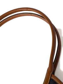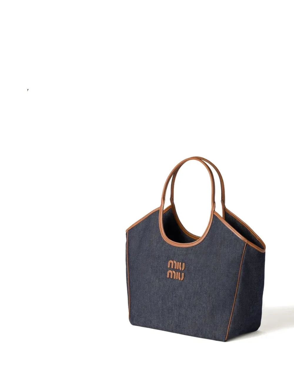 Elevate your style with the Miu Miu Ivy tote bag, crafted from rich blue denim fabric and accented with luxurious brown leather trims. Featuring sturdy top handles and a distinctive logo patch, this bag combines casual charm with refined elegance, making it the perfect accessory for everyday sophistication.