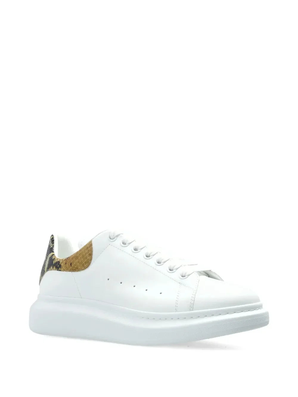 Step up your style with these Alexander McQueen sneakers featuring striking white leather and distinctive snakeskin detailing at the heel. The lace-up design ensures a secure fit, while the perforated pattern adds breathability and a modern edge. Finished with a thick white sole, these sneakers offer both comfort and a bold statement for any outfit.