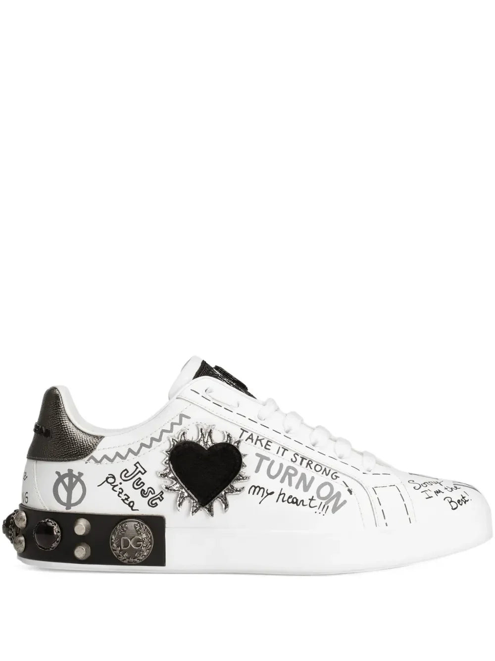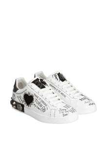 Step into fun with these white Portofino sneakers from Dolce & Gabbana! Featuring a playful all-over graphic print that'll make your feet the life of the party, these kicks come with a cheeky contrasting branded heel counter that says "look at me!" Lace 'em up with the front fastening, admire the quirky patch detail, and strut your stuff in designer style that refuses to take itself too seriously!