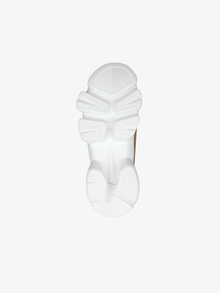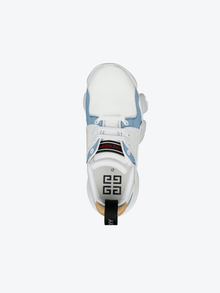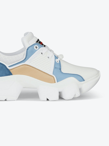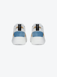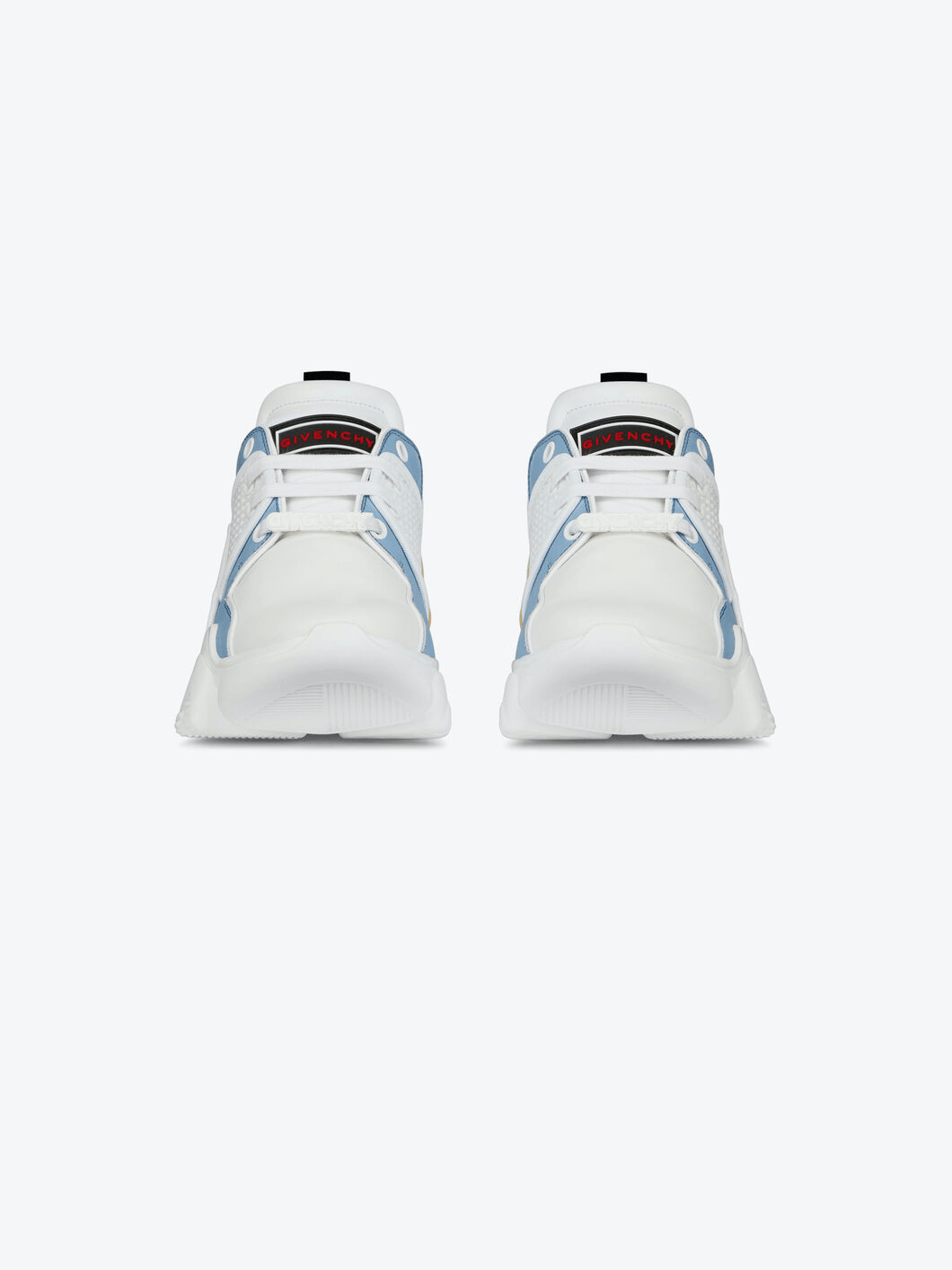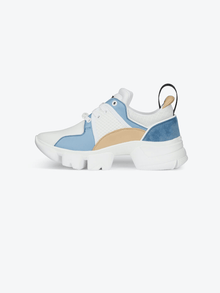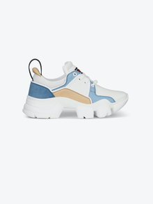 Baskets Jaw en cuir beige et bleu ciel, daim bleu ciel et néoprène et résille blancs avec semelle épaisse crantée style mâchoire de requin blanche, patch en caoutchouc noir et blanc avec signature GIVENCHY rouge sur la languette et plaque GIVENCHY en caoutchouc blanc sur les lacets. Bande GIVENCHY en jacquard noir au dos et signature GIVENCHY en relief sur le talon.