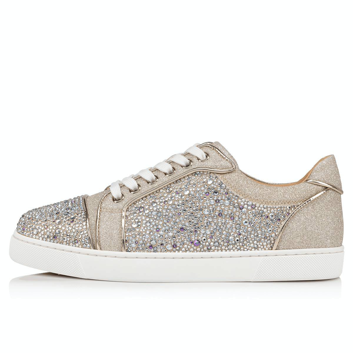 . Modèle iconique, la sneaker Vieira Strass s'habille cette saison de Veau Velours couleur platine constellé de strass et de paillettes irisées. Un assemblage raffiné entièrement doublé de cuir nude qui révèle en toute discrétion le savoir-faire unique de la Maison Christian Louboutin.Shipping & Returns