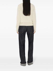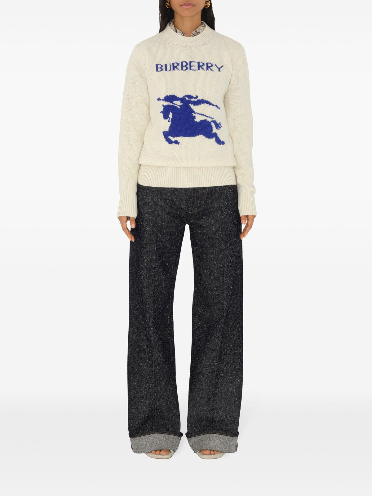 Indulge in luxury with the Burberry Equestrian Knight sweater. This stunning off-white sweater is crafted from a soft wool-cashmere blend and features a classic knitted construction. The signature Equestrian Knight motif adorns the front, adding a touch of elegance. With a crew neck, long sleeves, and ribbed cuffs and hem, this sweater provides both comfort and style. Made with a straight hem, it's the perfect addition to any wardrobe. Composition: Wool 71%, Cashmere 29%.
