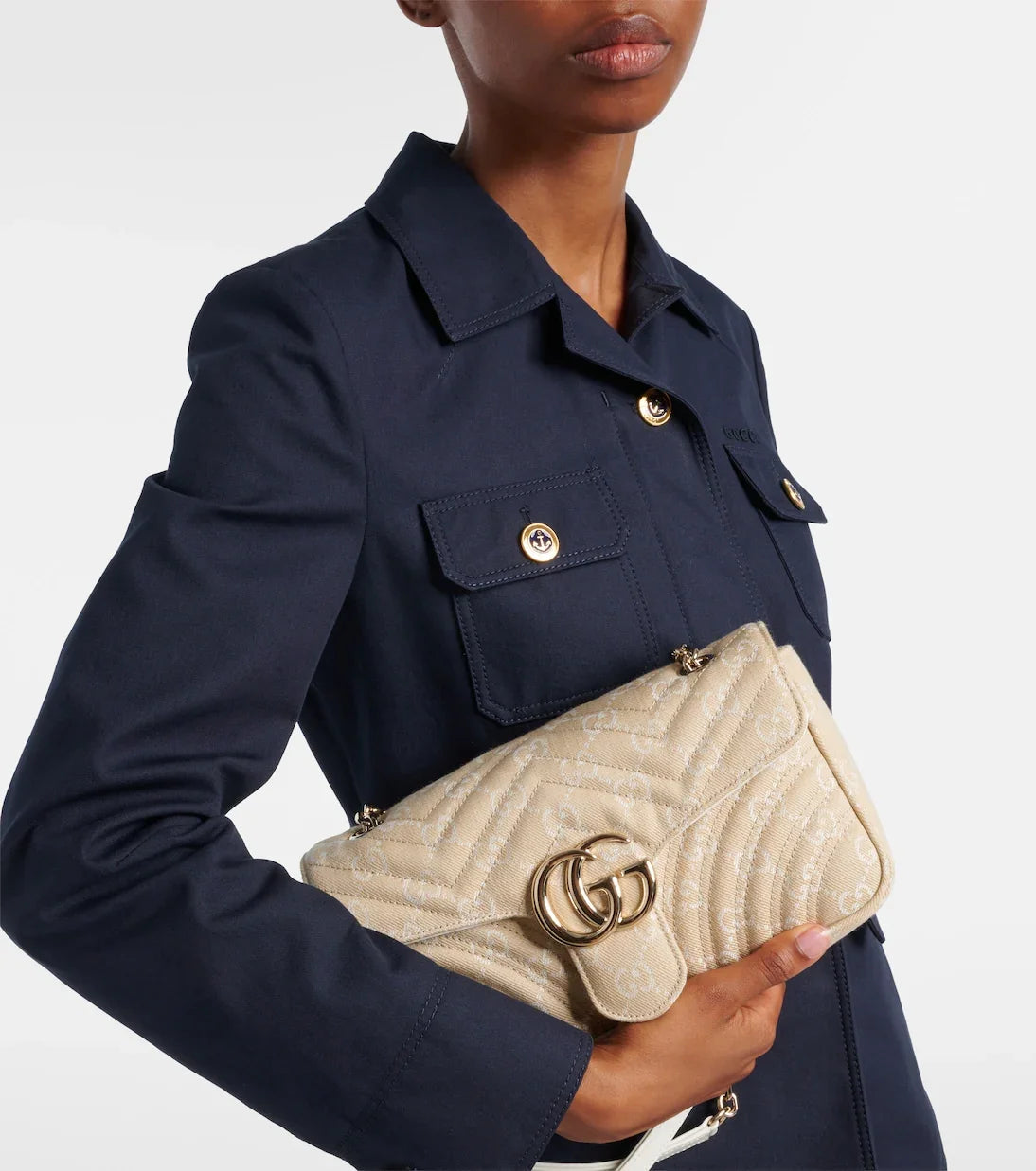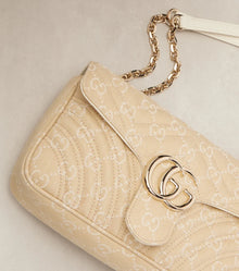 The GUCCI GG Marmont Small denim shoulder bag redefines classic elegance with its matelassé denim crafted in a distinctive all-over logo motif. Featuring iconic Double G hardware and a sleek chain strap, this bag effortlessly combines timeless style with modern flair. Perfect for elevating any outfit, it offers both sophistication and versatility for your everyday wardrobe.